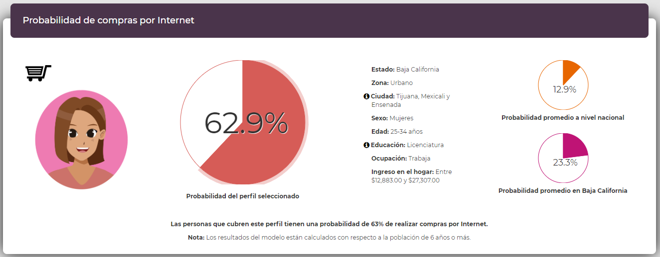 En el centro de la imagen se muestran las características sociodemográficas seleccionadas. Del lado izquierdo, la probabilidad de usar la TIC o de realizar la actividad por internet analizada; y, por último, a la derecha se muestra la probabilidad promedio de uso a nivel nacional y a nivel estatal.