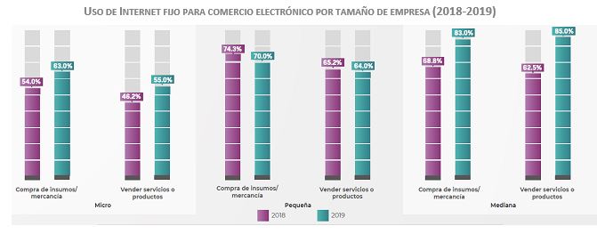En la encuesta se detalla que, en 2019, el 83% de las medianas empresas, el 70% de las pequeñas empresas y el 63% de las micro empresas utilizó el internet para la compra de insumos y mercancías.