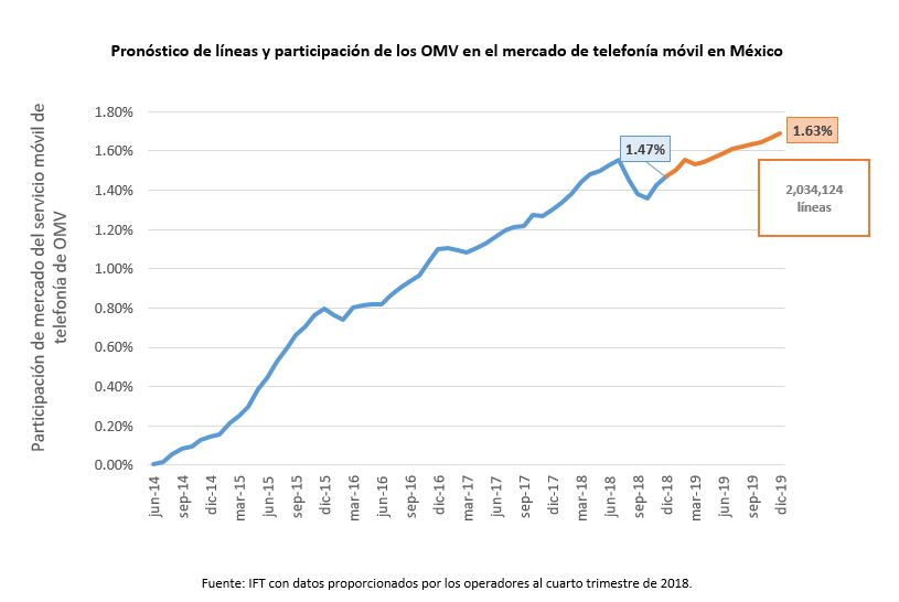 El análisis estima que, al cierre de 2018, las 1.7 millones de líneas reportadas por los OMV podrían llegar hasta 2.03 millones de líneas en 2019, un incremento de 268,568 líneas móviles, con lo que se espera que la participación de mercado de estos operadores sea de 1.63 por ciento.