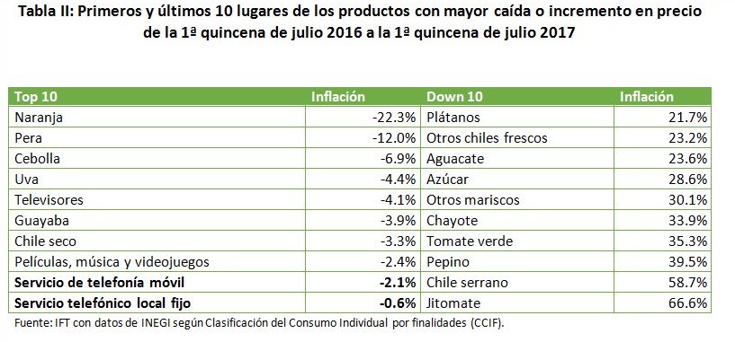 Es importante resaltar que de la 1ª quincena de julio 2016 a la 1ª quincena de julio 2017, de los 283 productos genéricos que se incluyen en la canasta del INPC, los precios de los servicios de telefonía móvil y telefonía fija se ubicaron en el en el noveno y décimo lugar de los que más disminuyeron, con una baja de 2.1% y 0.6% respectivamente. (Ver Tabla II).